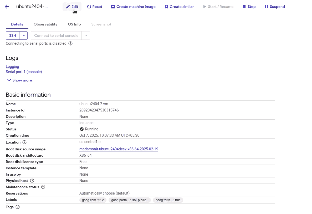 Back in the Google Cloud Console, open your VM’s => Click Edit.