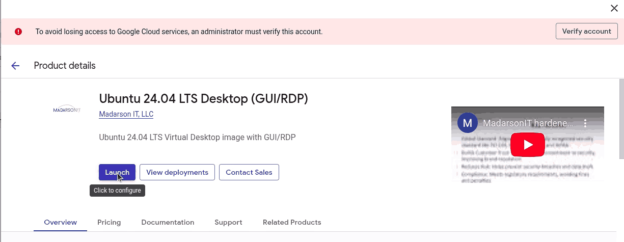 Select Ubuntu 24.04 LTS Desktop (GUI/RDP) published by Madarson IT LLC. This image already includes a pre-configured GUI—ideal for ThinLinc.